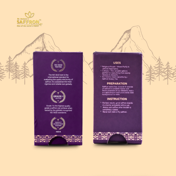 Dr. Rathore’s Saffron is a Grade-1 Certified Saffron test by international standard parameters “ISO.3632” which is the most trusted and recognized test globally, when it comes to assess saffron quality and purity. Sourced Directly from the pristine valleys of Kashmir. Known for its unmatched purity, vibrant aroma, and rich flavors. Daily consumption in small quantity will gives tremendous health benefits. Our unadulterated kesar is perfect perfect for spiritual (Pooja) uses. Enhance your lifestyle with this premium exported-quality saffron that offers a legacy of wellness and luxury.